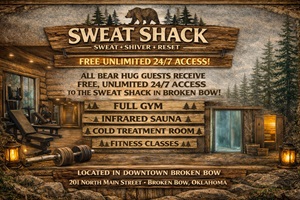 All Guest will also receive complimentary 24/7 unlimited access to the Sweat Shack in Broken Bow. This includes a full gym, infrared sauna, cold treatment room and all classes.